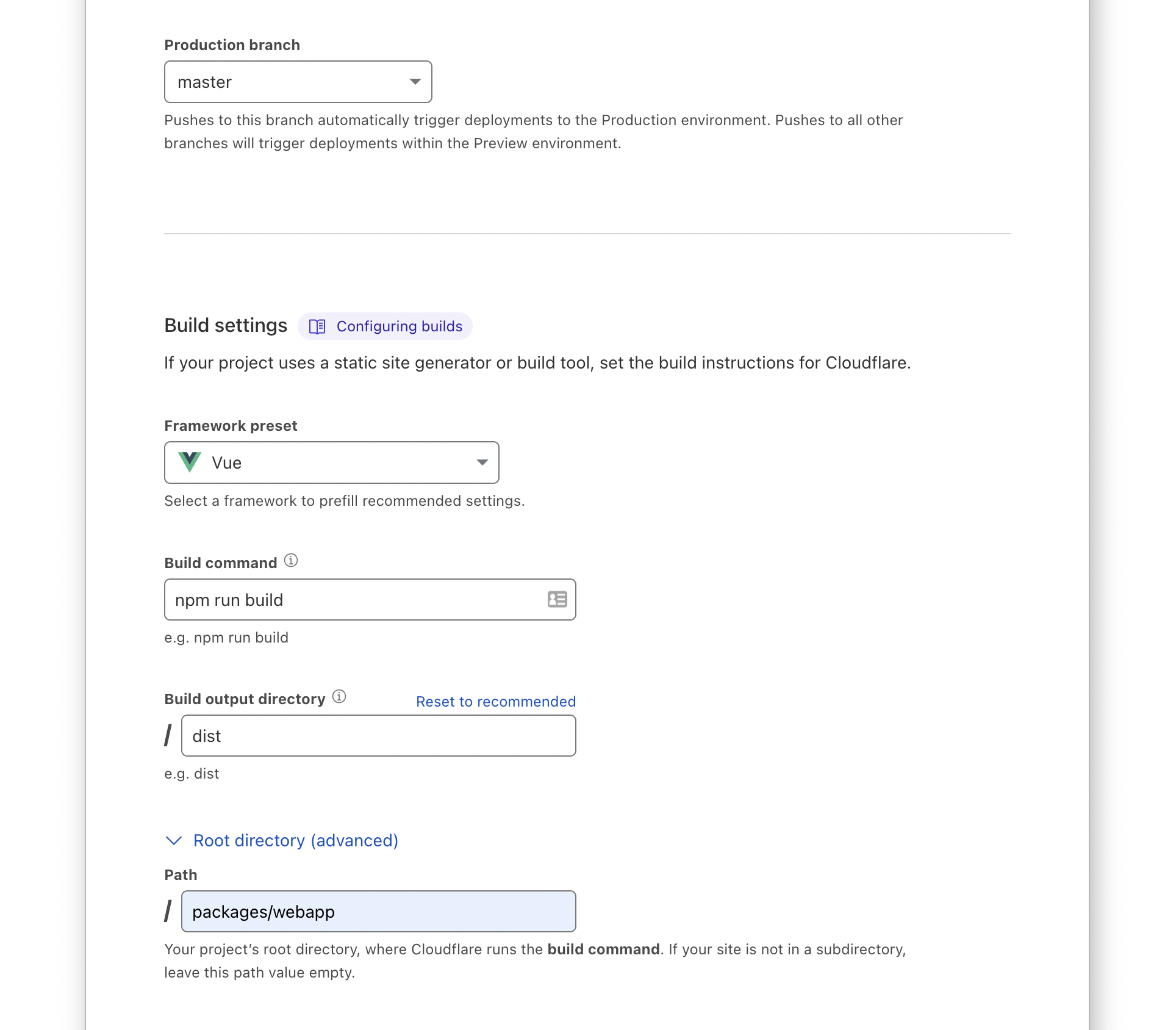 All I have left to do now is to push my local changes to the Github repository and the worker will be deployed. While the worker deploys, I will get the Vue application setup on Cloudflare Pages. I can easily do that from the cloudflare dashboard then navigating to pages. I will select my Github repository, then the vue preset and make some changes to the settings. For Cloudflare to access Github Repository it requires you to install the Cloudflare Github App to your Github Apps in the settings page in Github.
