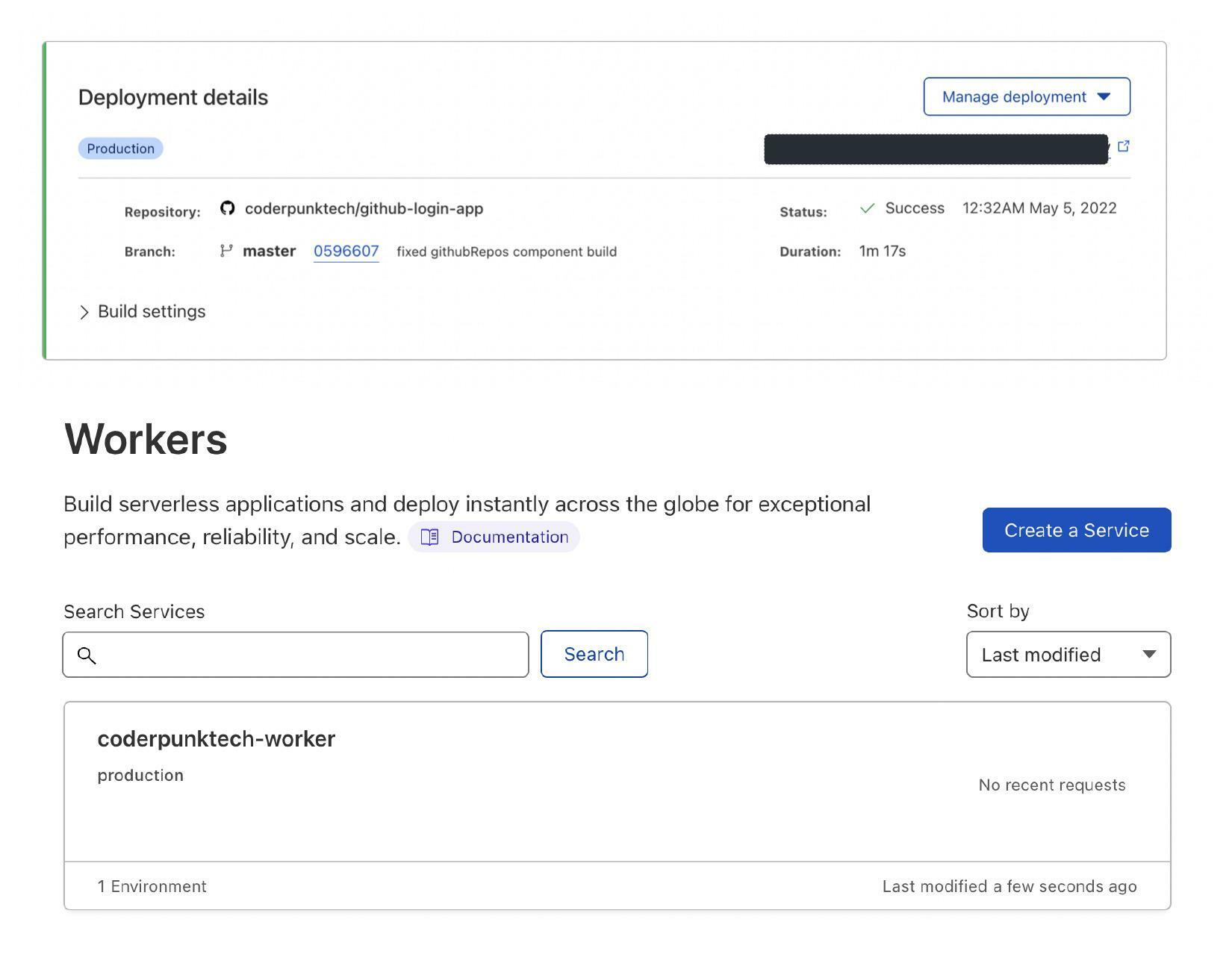 At this stage both my worker and webapp have been deployed successfully to cloudflare. Now I can go ahead and create my production Github OAuth app using the correct urls and configure the environment variables to the worker settings.