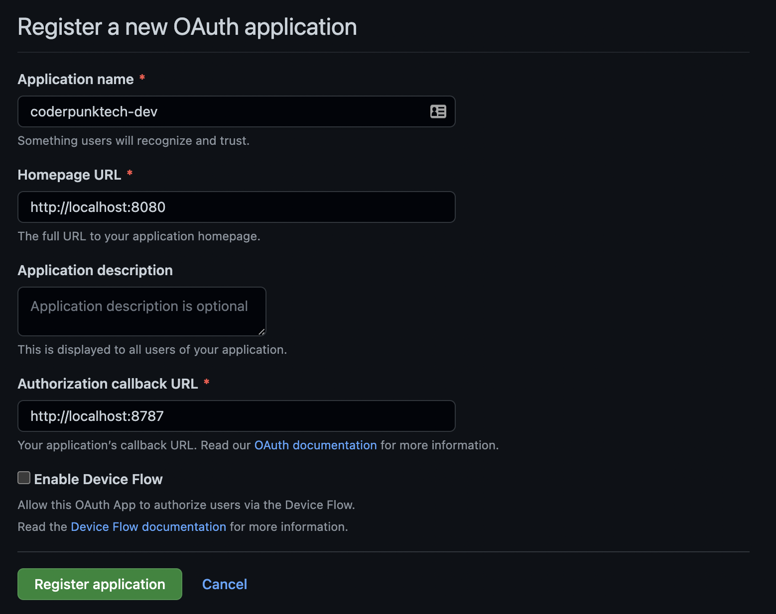 To create a Github OAuth app you can follow this github doc. For my Dev app I am going to use the following: